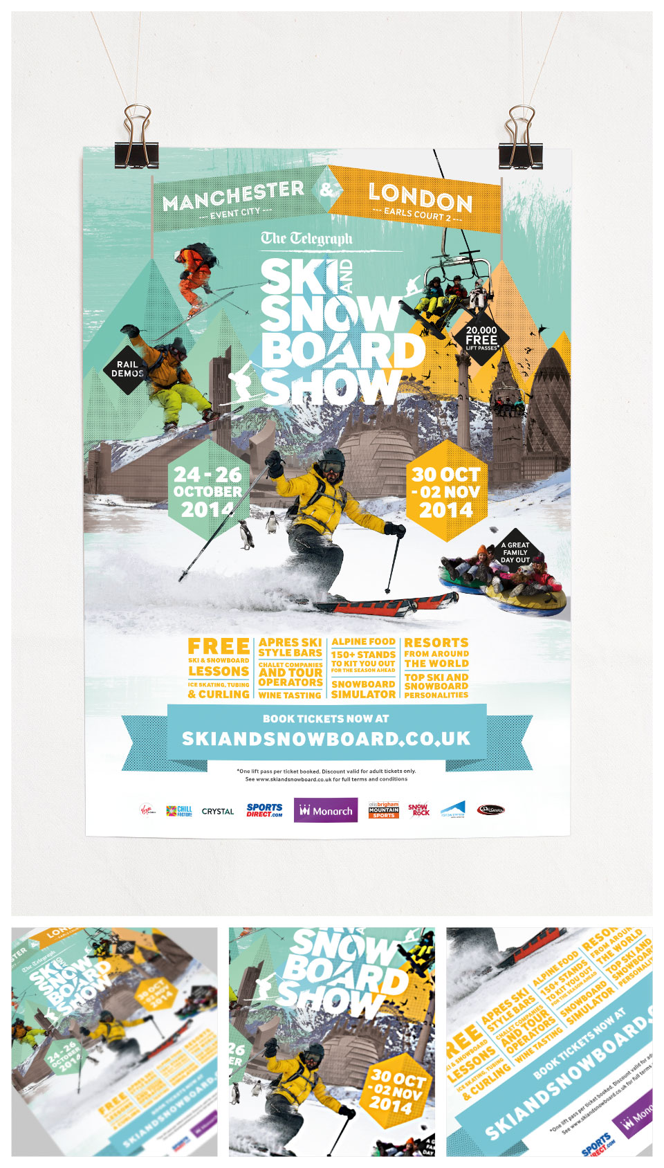 The advertising had to communicate to a wide audience, from serious skiers and snowboarders to general family fun ski and snowboard holidays. It also had to represent that the show is being held both in London and Manchester. My concept focused on having various genres of winter sports interacting in and around the typography and winter graphics for the show, emanating from a graphical mountainous landscape. Also separating the venue information by hues of blues and greens for Manchester and yellows for London.